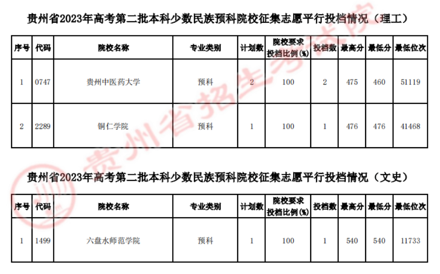贵州省2023年高考第一批本科院校平行志愿投档情况