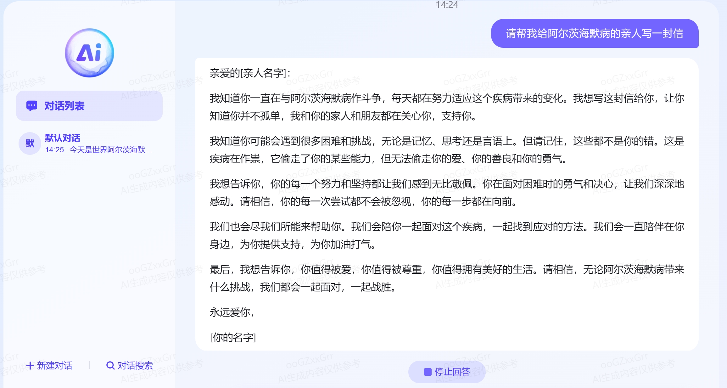 今天是“世界阿尔茨海默病日”,我们的AI(人工智能大语言模型)小助理替我们给阿尔茨海默病的患者写了一封信,希望能给他们一些和病魔抗争的能量↓↓↓