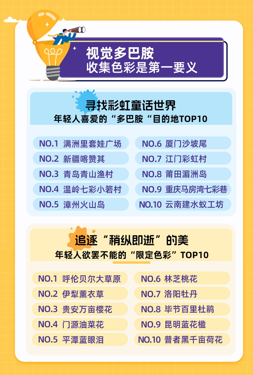 年轻人对“多巴胺”的偏爱已经从穿搭蔓延到旅行。马蜂窝通过对今年1月1日至今的用户搜索、浏览、互动、分享、预订等数据综合分析,发布首份《年轻人“多巴胺”旅行报告》,从需求出发解读年轻人旅游出行新理由、新趋势。