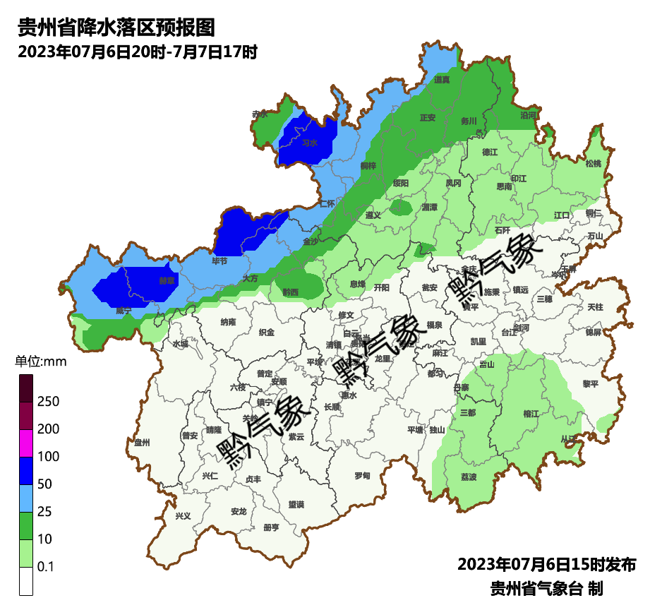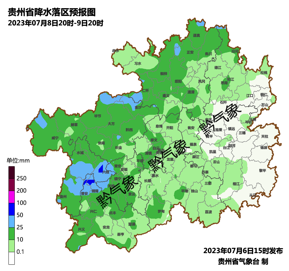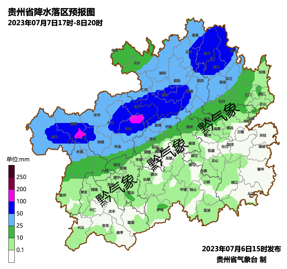7日傍晚到8日白天,省的北部地区阴天间多云有阵雨或雷雨,雨量中到大雨,其中毕节市、遵义市南部和东北部、铜仁市北部、贵阳市北部边缘局地暴雨,部分乡镇大暴雨,其余地区多云有分散阵雨或雷雨,省的南部边缘部分县市午后有35℃以上高温;