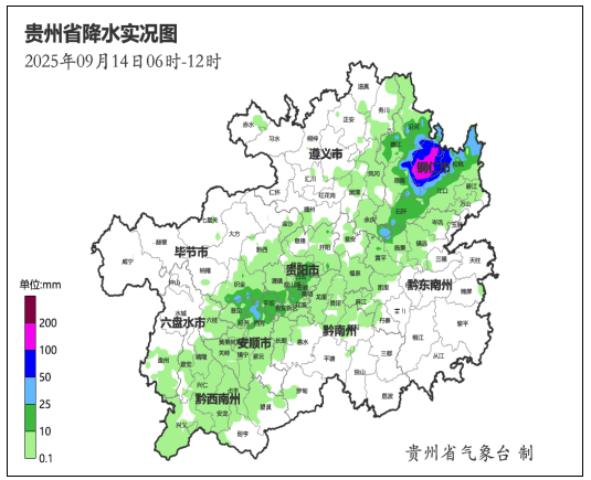 9月14日06时至12时,大暴雨出现在铜仁市的印江、思南、松桃3县域内的26个观测站(雨量最大为印江县峨岭街道峨岭村小穴194.2毫米),暴雨出现在毕节市的织金,遵义市的余庆,铜仁市的印江、德江、思南、松桃、江口、沿河8县域内的48个观测站,大雨有75个观测站,中雨有230个观测站。安顺市的普定、西秀,毕节市的织金,贵阳市的乌当、云岩、花溪,遵义市的余庆,铜仁市的印江、德江、思南、松桃、江口、沿河县13个县(区)157站次出现短时强降水,小时雨强最大为印江县峨岭街道峨岭村小穴74.9 毫米(出现在14日08时至09时)。