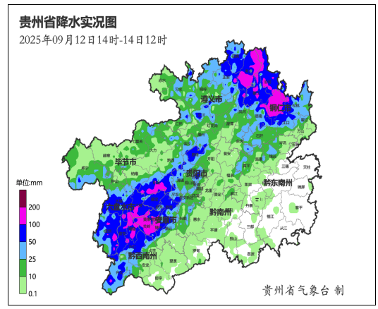 9月12日14时至14日12时,铜仁市的印江县峨岭街道峨岭村小穴累计雨量218.6毫米,六盘水市的六枝、盘州,安顺市的关岭、普定、西秀、镇宁,毕节市的织金,贵阳市的清镇,遵义市的务川、正安,铜仁市的印江、德江、思南、松桃、江口、沿河,黔西南州的兴义、兴仁、普安、晴隆、贞丰21县(市、区)域内的227个观测站累计降雨量100~199.9毫米之间,44县(市、区)域内的631个观测站累计降雨量在50~99.9毫米之间,643个观测站累计降雨量在25~49.9毫米之间。55个县(市、区)976站次出现短时强降水,小时雨强最大为晴隆县花贡镇花贡坪山81.4 毫米(出现在12日23时至13日00时)。