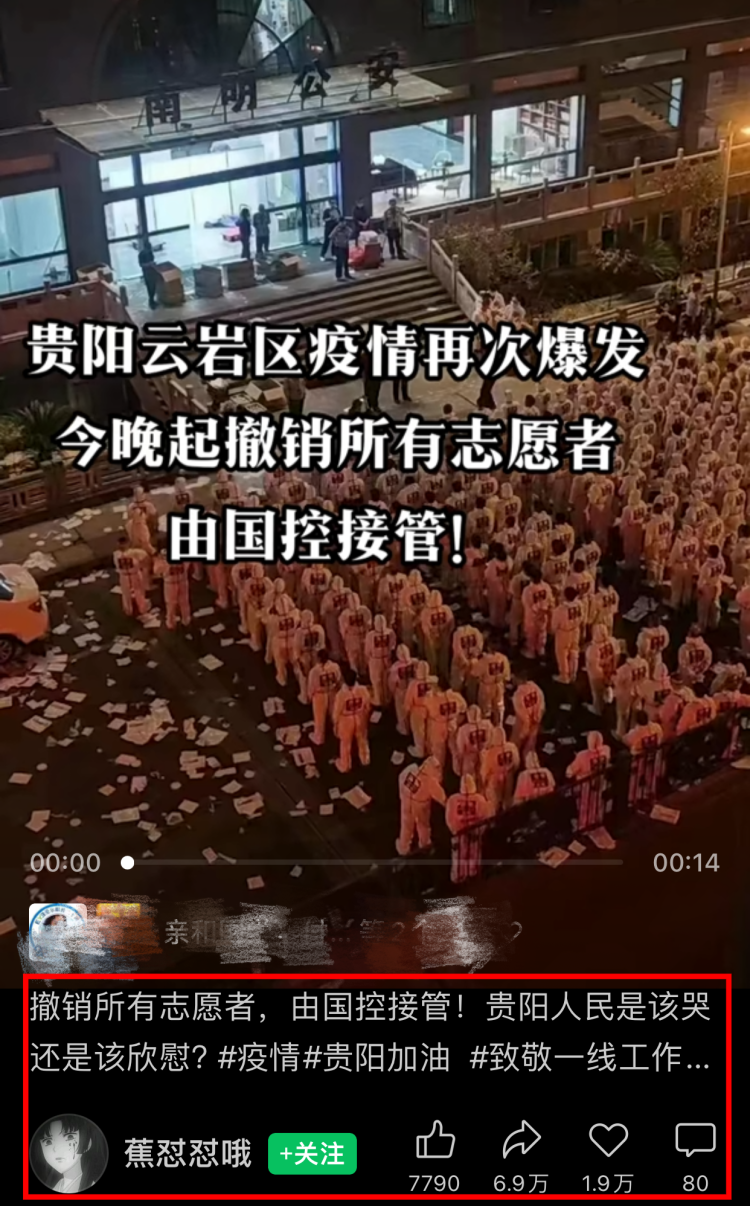 一则《云岩区撤销所有志愿者 由国控接管!》的短视频