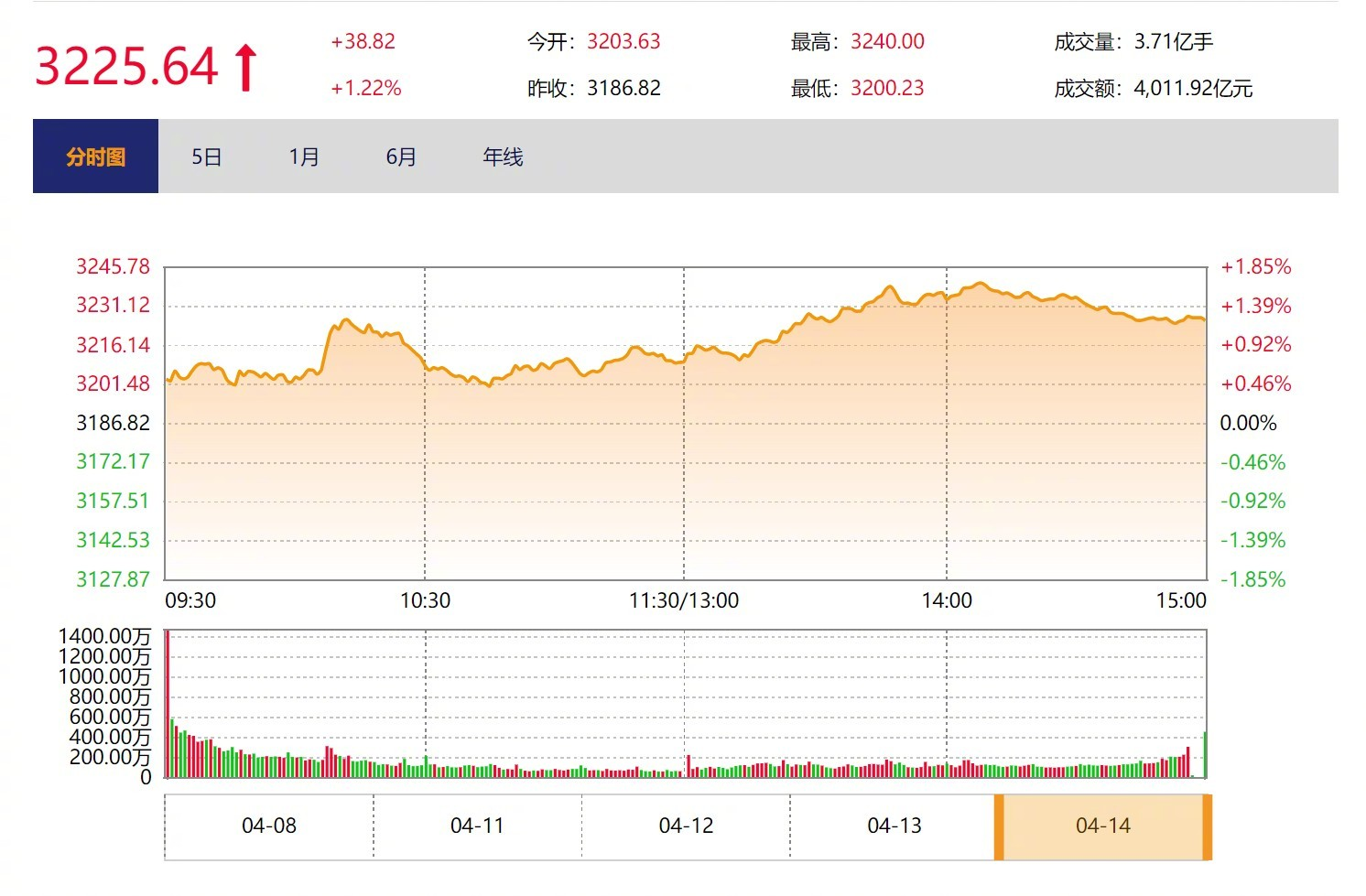 ▲4月14日,沪深两市高开,国务院常务会议宽松信号拉动大盘,沪指反弹涨1.22%。白酒、地产携手大涨,两市超3000只个股上涨,仅电力设备等板块飘绿。宁德时代盘中跌逾2%,煤炭板块再度领涨,食品饮料走强,贵州茅台盘中涨逾3%,五粮液盘中涨超6%。房地产板块涨幅居前,保利发展一度涨超8%,泛海控股等多股涨停。