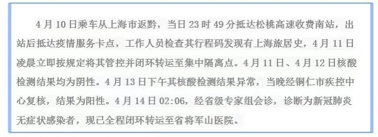 ▲4月14日02:06,经省级专家组会诊,铜仁市松桃县新增1例新冠肺炎无症状感染者,为省外返黔闭环管理人员,已全程闭环转运至省将军山医院。目前,流调溯源、核酸筛查等应急处置工作正在有序开展。
