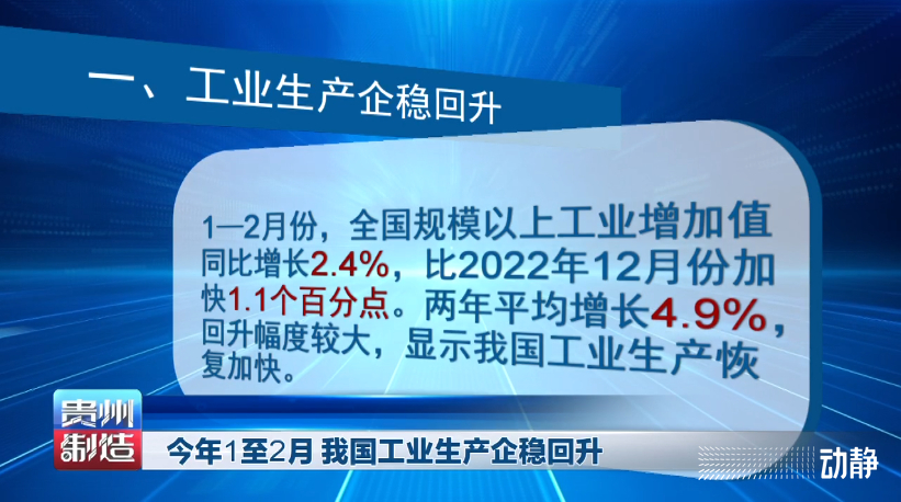 一、工业生产企稳回升。1—2月份,全国规模以上工业增加值同比增长2.4%,比2022年12月份加快1.1个百分点。两年平均增长4.9%,回升幅度较大,显示我国工业生产恢复加快。