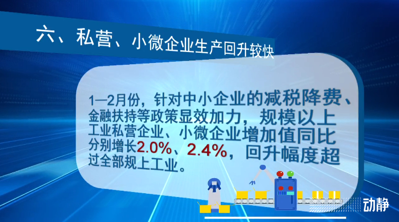 六、私营、小微企业生产回升较快。1—2月份,针对中小企业的减税降费、金融扶持等政策显效加力,规模以上工业私营企业、小微企业增加值同比分别增长2.0%、2.4%,回升幅度超过全部规上工业。