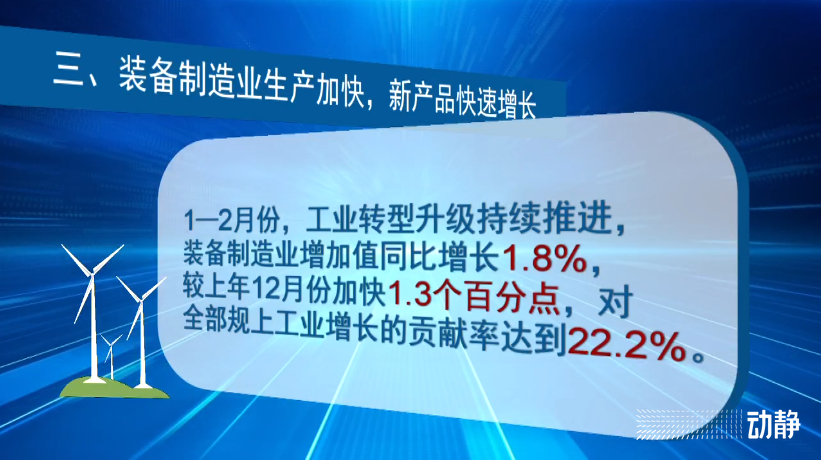 三、装备制造业生产加快,新产品快速增长。1—2月份,工业转型升级持续推进,装备制造业增加值同比增长1.8%,较上年12月份加快1.3个百分点,对全部规上工业增长的贡献率达到22.2%。新产品延续快速增长态势,1—2月份,风力发电机组、充电桩、光伏电池等新能源产品产量分别增长103.5%、66.7%、40.8%。