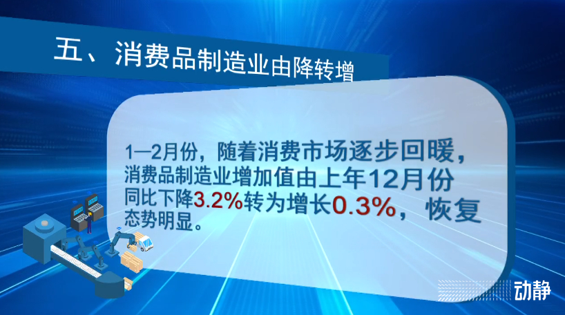 五、消费品制造业由降转增。1—2月份,随着消费市场逐步回暖,消费品制造业增加值由上年12月份同比下降3.2%转为增长0.3%,恢复态势明显。