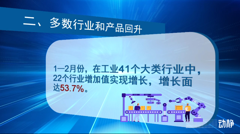 二、多数行业和产品回升。1—2月份,在工业41个大类行业中,22个行业增加值实现增长,增长面达53.7%。统计的620种主要工业产品中,364种产品产量增速较上年12月份加快或降幅收窄,占58.7%。