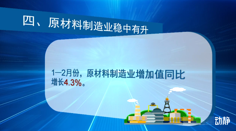 四、原材料制造业稳中有升。1—2月份,原材料制造业增加值同比增长4.3%。从行业看,钢铁和有色分别增长5.9%、6.7%,较上年12月份加快3.1和0.4个百分点;建材由降转增,增长0.7%,上年12月份为下降1.8%。