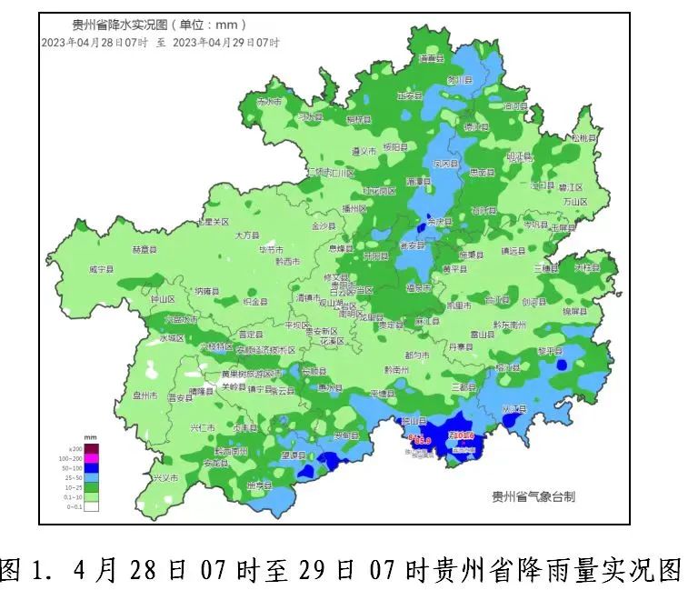 4月28日07时至29日07时,大暴雨出现在荔波县永康101.6毫米,暴雨出现在独山、罗甸、荔波、从江、望谟、黎平、余庆、三都、平塘、瓮安10县域内的37个观测站,大雨有286个观测站,中雨有949个观测站,小雨有1648个观测站。