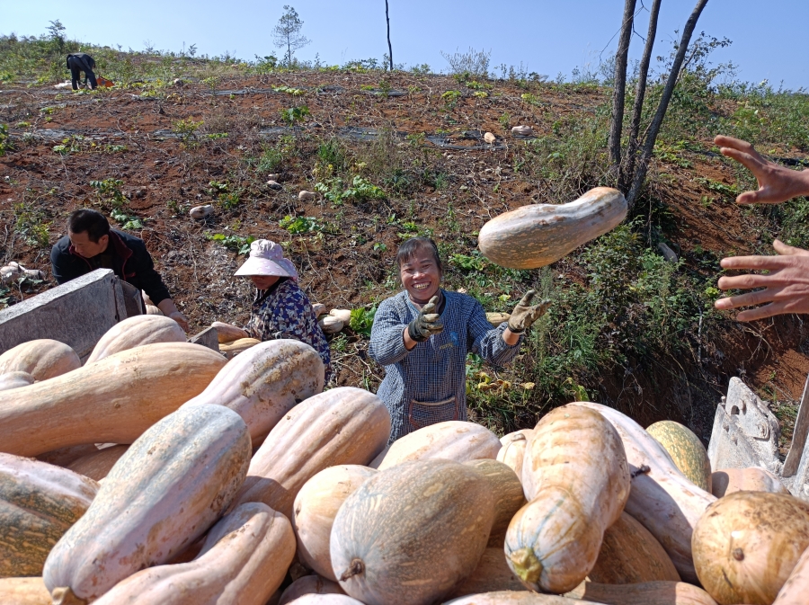 “这片油茶基地,刚开始移栽油茶苗时,我们来务工,现在种植南瓜,我们又来务工。”村民田应珍说,等到雨季来临,土壤湿润了就开始移栽南瓜苗,村里农业产业多,一年四季都不愁活干。