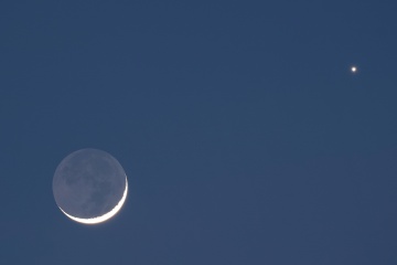 记者从北京天文馆获悉,今天(23日)傍晚,夜空将上演“金星伴月”。日落时,向西方天空看去,一弯细细的蛾眉月距离金星仅1.4度,而且月亮和金星的地平高度将近40°,给人们留下了充裕的观测时间。不仅如此,月亮暗影部分还被地球反射光照亮。新月抱旧月,金星来相伴,非常值得观赏,这也是4月份最后一场重要天象。