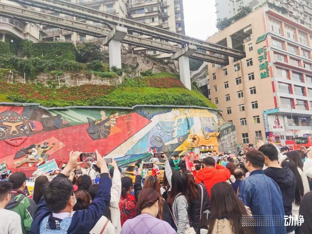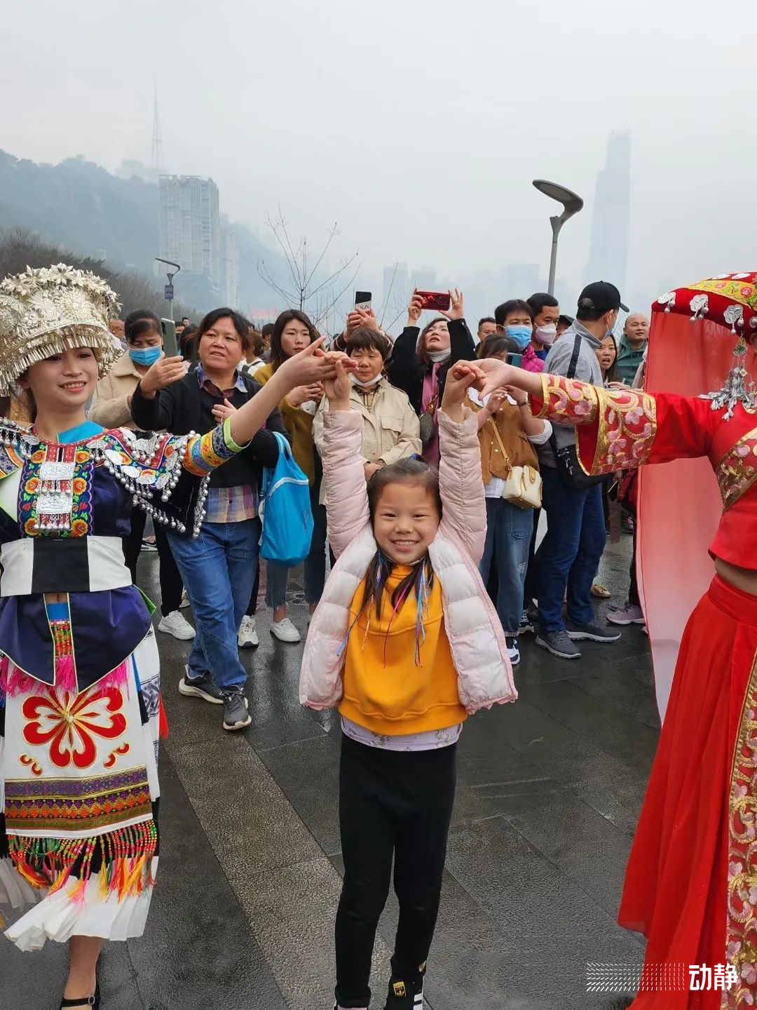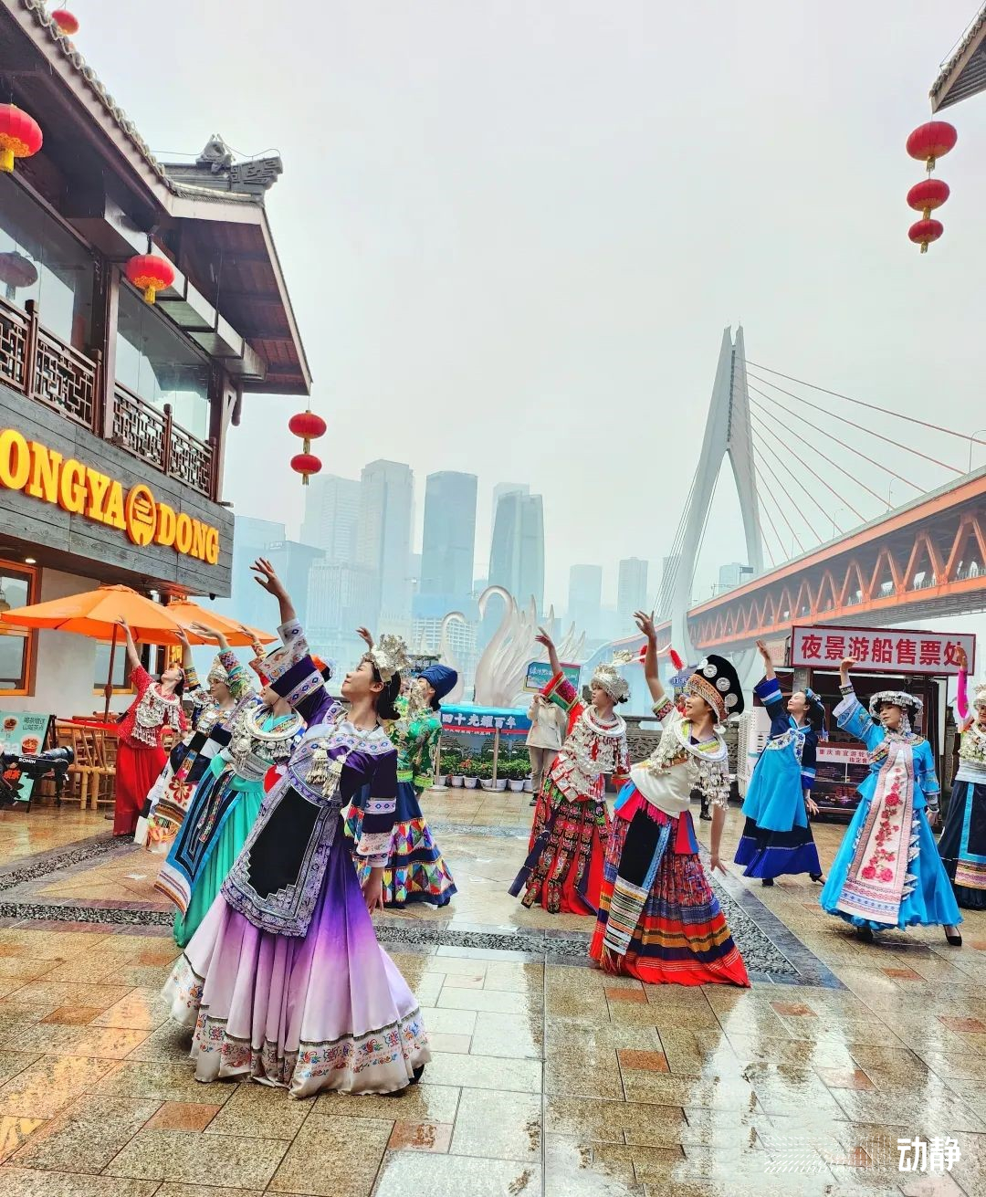当天上午,路演还未开始,身着少数民族服装的演员们出现在洪崖洞就被好奇的游客们围观起来,纷纷驻足拍照、合影。
