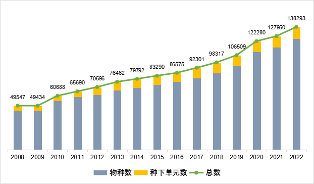 《中国生物物种名录》2022版共收录物种及种下单元138293个,其中物种125034个,种下单元13259个。2022版中国生物物种名录较2021版新增10343个物种及种下单元,其中动物界脊索动物门的哺乳纲、爬行纲、两栖纲进行整体更新,共新增279个物种,节肢动物门昆虫纲新增7498个物种,蛛形纲新增119个物种;植物界新增794个物种;真菌界新增1274个物种。