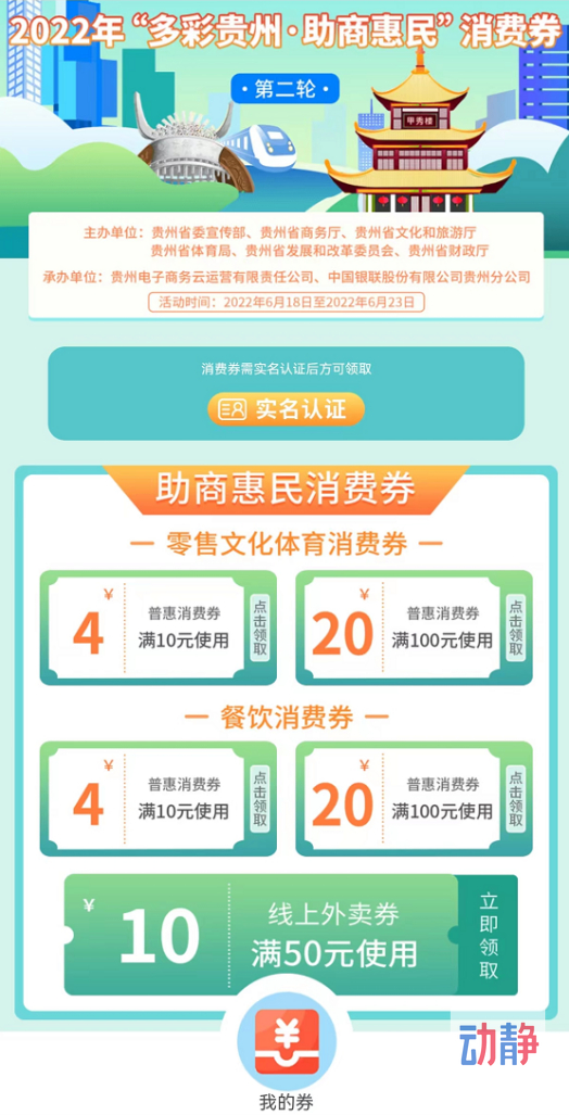 第二轮“多彩贵州·助商惠民”消费券分别在6月18日、19日上午10点进行领取,发放的券值为满10元减4元、满50元减10元、满100元减20元的“零售文化体育消费券”和“餐饮消费券”。此外,还有满50元减10元的“线上外卖消费券”,该券仅限在一码贵州外卖平台“黔味达”使用。本轮消费券领取成功后需在6月23日23:59分前进行使用,超时未使用的消费券将会自动作废。