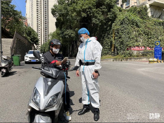 由于该路段地处南明区与经开区交界处,过往人群流量大、情况复杂,瞿文枫每天需要穿戴近10斤的防护服和警用装备至少站立5小时,对过往居民进行防疫疏导。尽管天气凉爽,瞿文枫的手臂不到10分钟就已经被汗水浸湿。