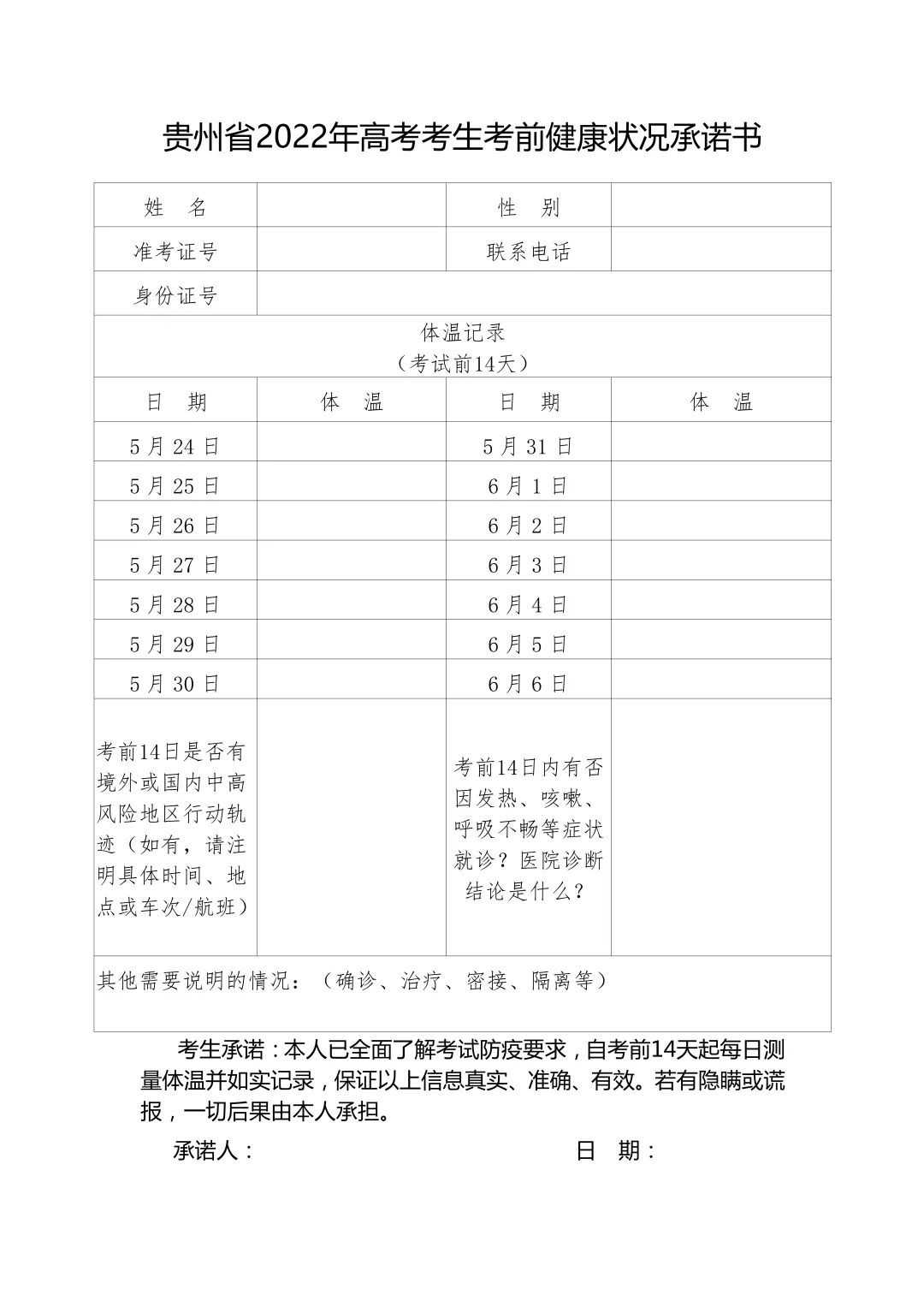 按照《贵州省2022年普通高等学校招生全国统一考试疫情防控须知》要求,考生从考前第14天开始(5月24日起),每日自行测量体温并如实填写《贵州省2022年高考考生考前健康状况承诺书》。体温测量异常以及身体出现发热(体温高于37.3℃)、干咳、乏力、鼻塞、流涕、咽痛、腹泻等症状的要及时就医,并保存好诊断材料备查。