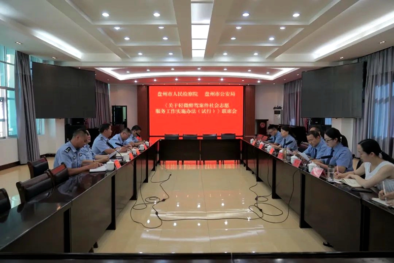 7月26日,盘州市检察院与盘州市公安局联合会签《关于开展轻微醉驾案件社会志愿服务工作的实施办法(试行)》,并就落实该《办法》的具体措施召开首次联席会议。