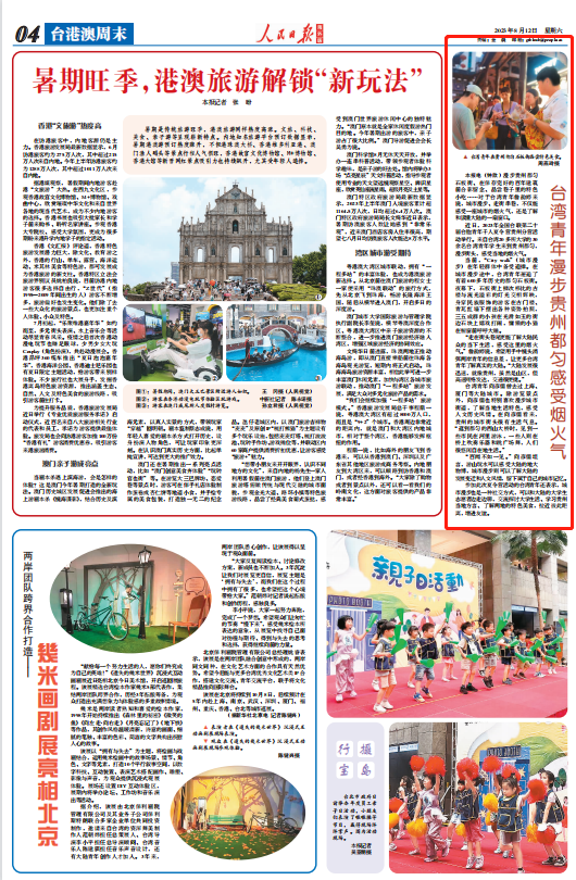 “走在街头巷尾更能了解大陆民众的当下生活,感受这里的烟火气。”詹韵婷说,希望用手中镜头消弭两岸青年的信息差,让更多台湾青年了解真实的大陆。“大陆发展很迅速,就像贵州,虽然是山区,但高速网络发达,交通很便捷。”