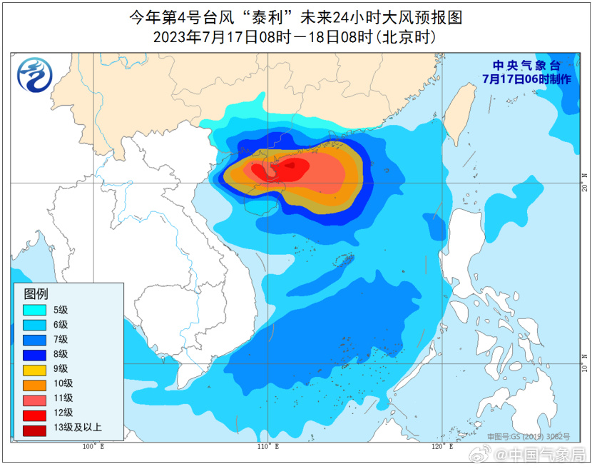 大风预报:7月17日08时至18日08时,南海大部、北部湾、琼州海峡、广东沿海、广西沿海、海南岛沿海、西沙、中沙、南沙及黄岩岛附近海面将有6-8级大风,其中南海北部海域、琼州海峡、北部湾北部海域、广东中西部沿海、广西沿海、海南岛北部风力有9-11级,台风中心经过的附近海域和岛屿风力有12-14级,阵风15-16级。