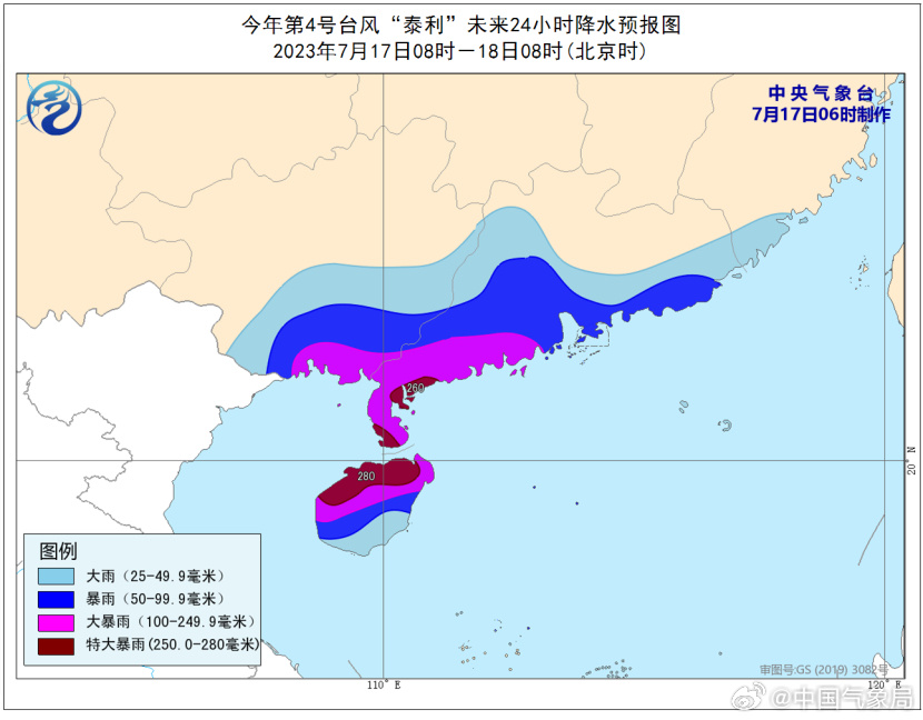 降水预报:7月17日08时至18日08时,广东西部和南部、广西中南部、海南岛、福建南部等地部分地区有大到暴雨,其中,广西南部、广东西南部、海南岛中北部等地部分地区有大暴雨,广东西南部沿海、海南岛北部等地局地特大暴雨(250~280毫米)。