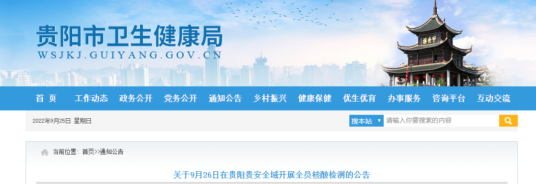 根据贵阳贵安当前疫情防控形势,经贵阳市疫情防控现场处置省市联动指挥部研究,决定于2022年9月26日在贵阳贵安全域开展全员核酸检测。现将有关事宜通告如下: