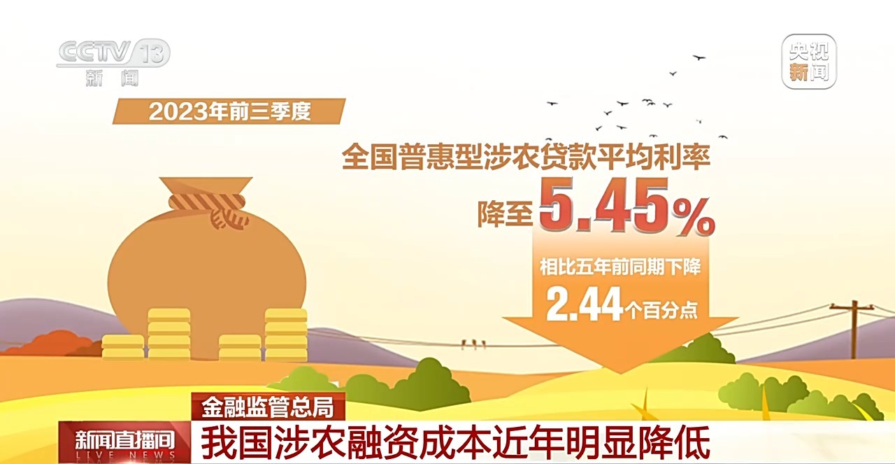 金融监管总局的统计显示,近年来我国涉农融资成本明显降低,2023年前三季度,全国普惠型涉农贷款平均利率降至5.45%,相比五年前同期下降2.44个百分点。