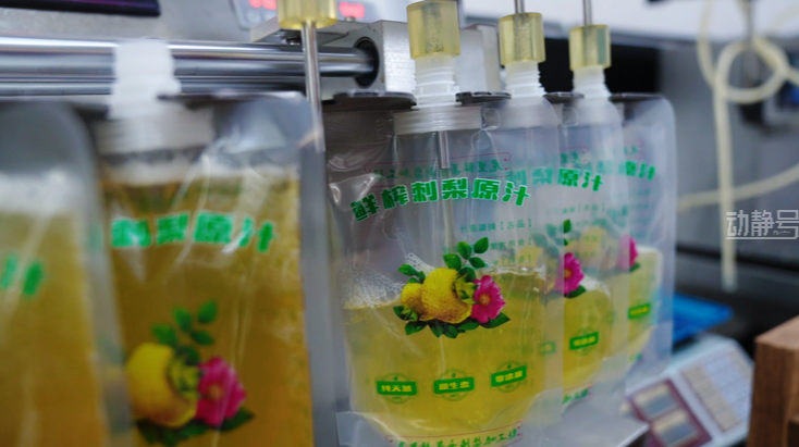 走进加工坊,去刺清洗机隆隆作响,鲜果在流水线上经历搅碎、榨汁、巴氏杀菌等多道工序,最终封装成袋,变为清亮醇厚的“致富汁”。从枝头到车间,从果实到果汁,刺梨的每一次“变身”,都为这片土地注入新的生机。
