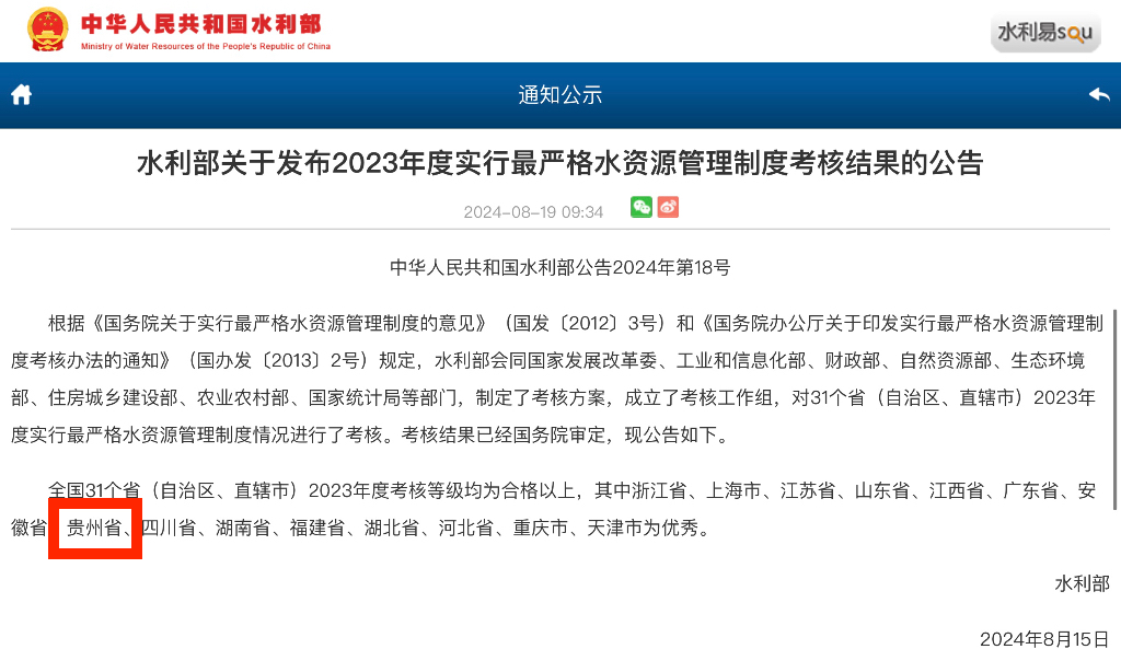 昨天(8月19日),国家水利部官网发布了2023年度实行最严格水资源管理制度考核结果,贵州省考核等级为“优秀”。这是自2021年以来,贵州省连续第三年在全国实行最严格水资源管理制度考核中获得优秀等次。