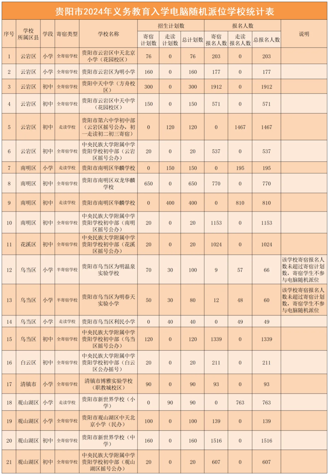 贵阳市2024年义务教育入学电脑随机派位学校统计表