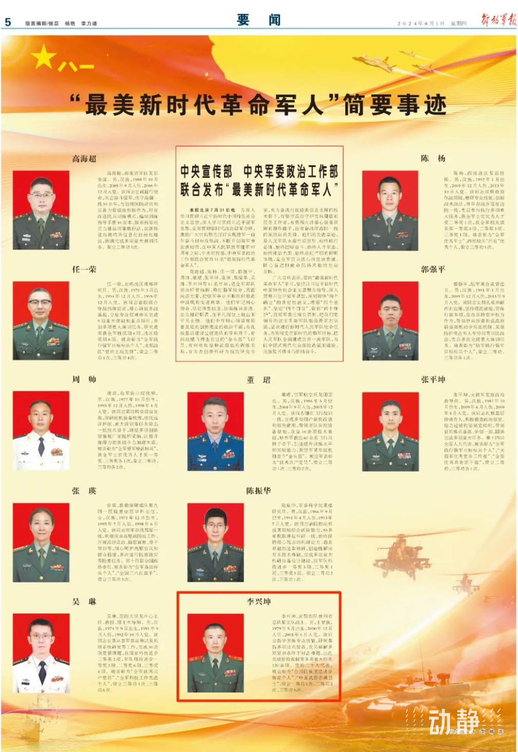 在中国人民解放军建军97周年之际,中央宣传部、中央军委政治工作部联合发布11名“最美新时代革命军人”。高海超、陈杨、任一荣、郭强平、周帅、董珺、张平坤、张瑛、陈振华、吴琳、李兴坤等11名官兵,是全军部队坚决听党指挥、勇扛强军使命、巩固纯洁光荣,把强军事业不断推向前进中涌现的先进典型。他们牢记初心使命、坚定理想信念,加强练兵备战、忠实履行职责,在平凡岗位上做出不平凡业绩。