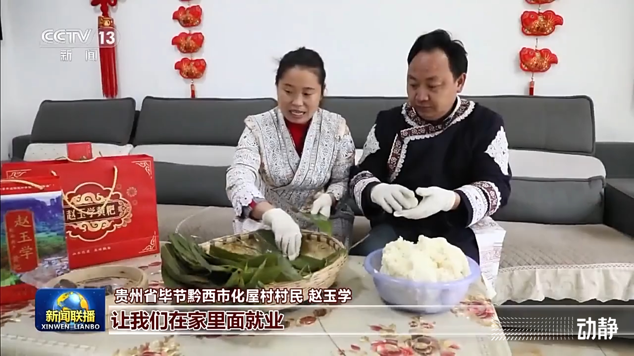 位于贵州大山深处、乌江源头的古老苗寨化屋村,灯笼高挂,腊肉飘香,炊烟袅袅里,尽是幸福的味道。村民赵玉学正在家里和妻子忙着包黄粑。两年前的春节前夕,习近平总书记走进化屋苗寨。在易地搬迁来的村民赵玉学家,总书记和他们一家人一起制作当地传统节日食品黄粑,并叮嘱当地干部,要积极发展乡村产业,方便群众在家门口就业,让群众既有收入,又能兼顾家庭。