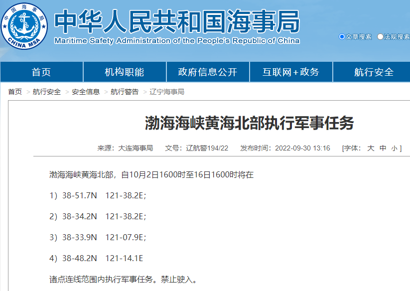 据中国海事局网站消息,大连海事局发布航行警告,自10月2日16时至16日16时,渤海海峡黄海北部执行军事任务,禁止驶入。
