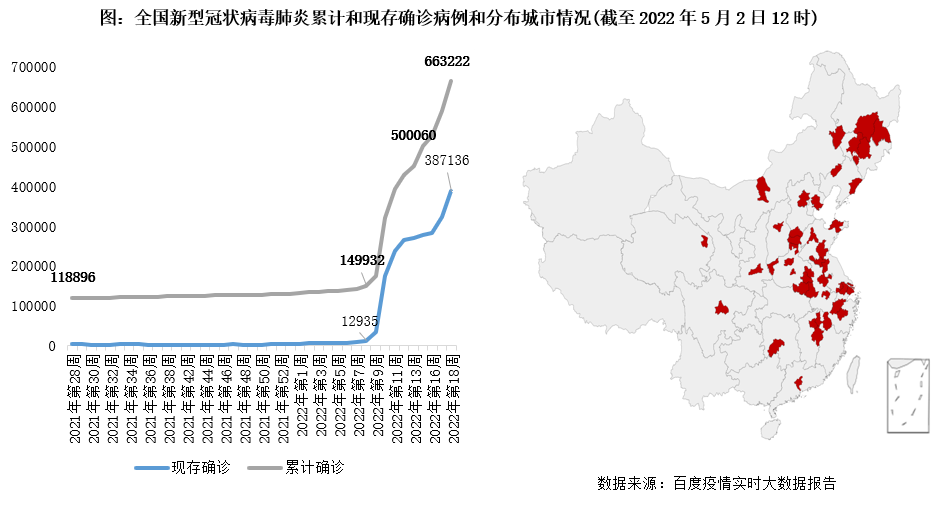 截止至2022年5月1日,全国累计报告新型冠状病毒肺炎确诊病例66万例,较年初增加53万例,现存确诊病例39万例。全国超过38个城市发布“静态管理”疫情防控通告。其中上海、上饶、哈尔滨等仍处在局部或全域静态管控中。西宁、唐山、芜湖、西安等虽已解除区域静态管理,但宏观经济运行遭遇了长时间静止。如长春连续“静态管理”达48天。