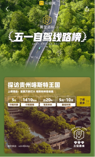 此外,“五一”假期,自驾游的热度持续走高。节前,马蜂窝黄金路标“‘五一’自驾线路榜”推荐的三钻路线中,贵州境内的“探访贵州喀斯特王国”的线路吸引了不少自驾爱好者前来体验。
