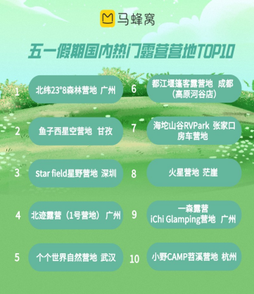 马蜂窝大数据显示,近一周各地“露营”相关搜索热度平均涨幅超过130%。广州从化的北纬23°8森林营地以其森林农艺体验,在本次“五一”假期国内热门露营营地排名第一位。