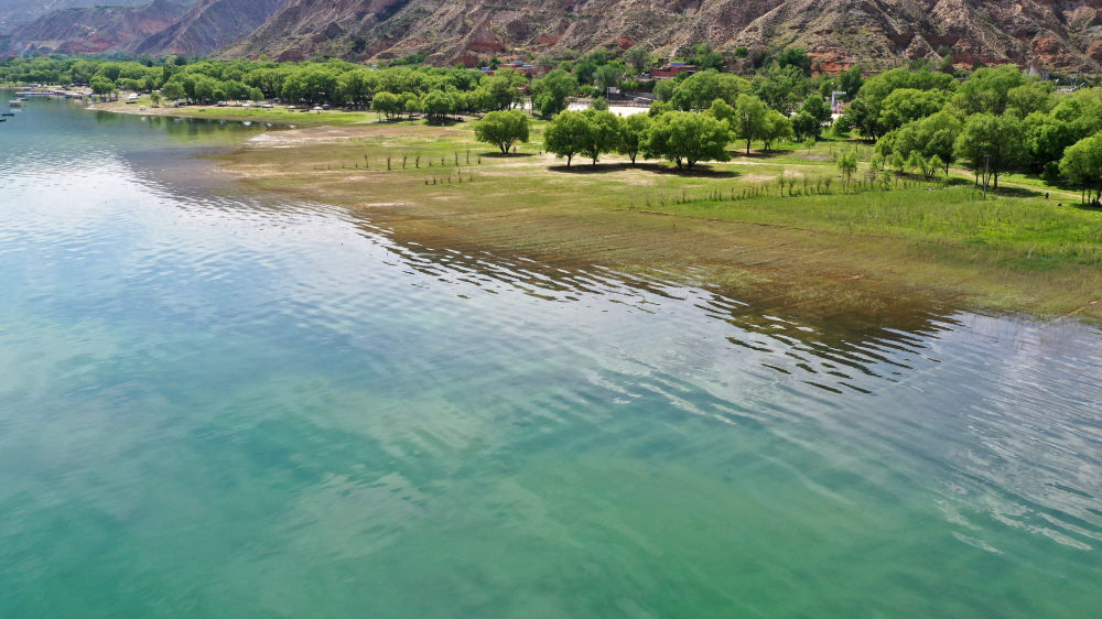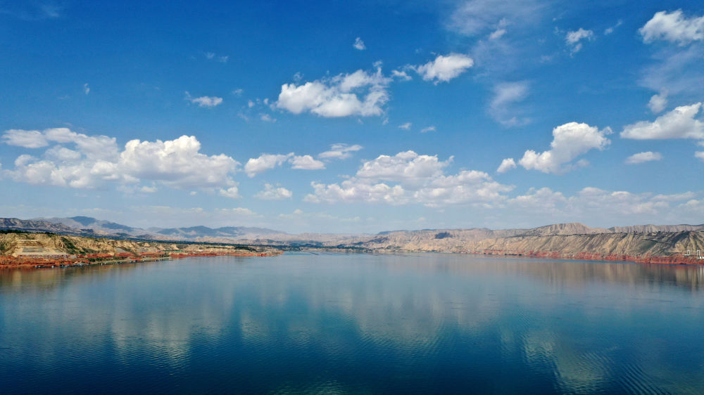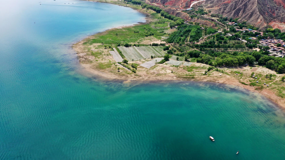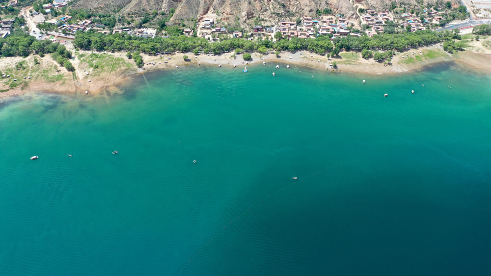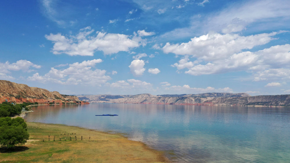 位于甘肃省临夏回族自治州永靖县境内刘家峡水库的黄河三湾碧波荡漾、岸线蜿蜒,片片小舟在水面摇曳,呈现一幅夏日清新画卷。