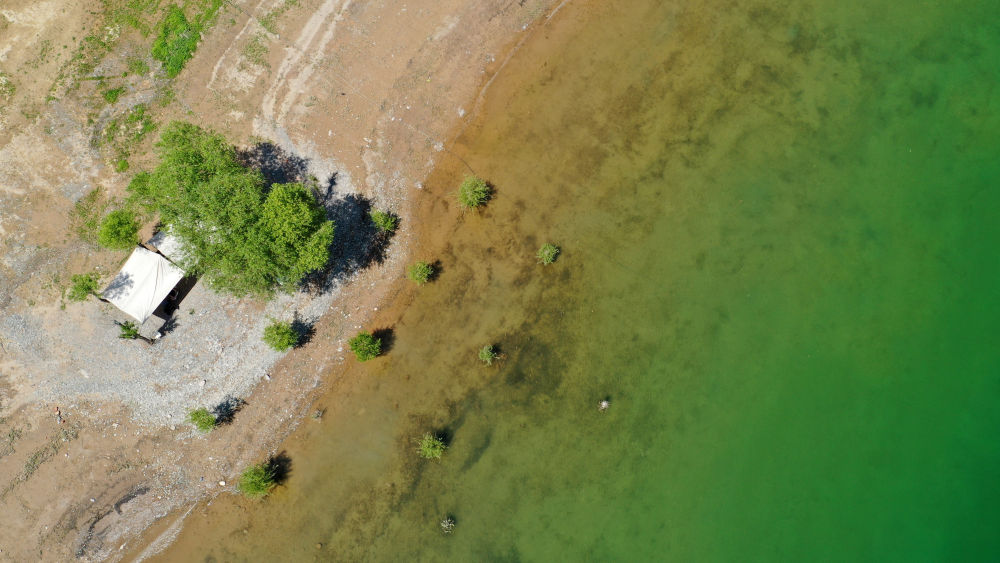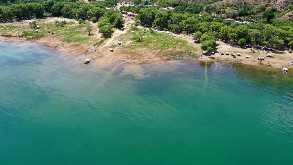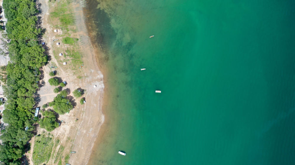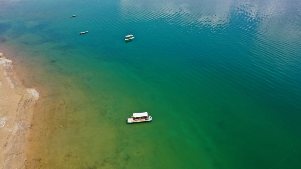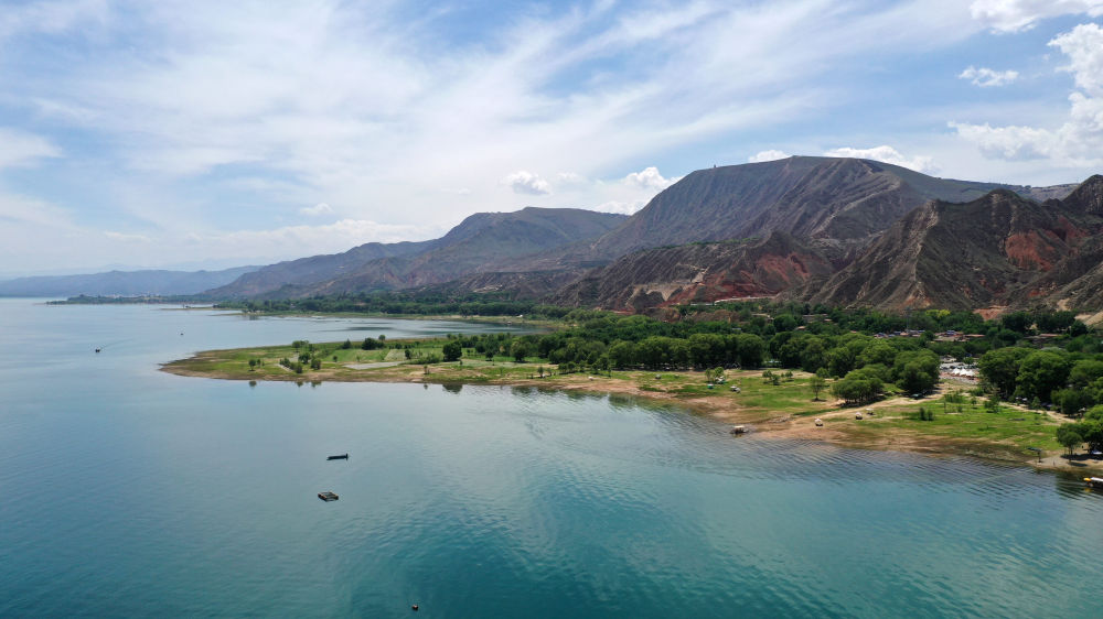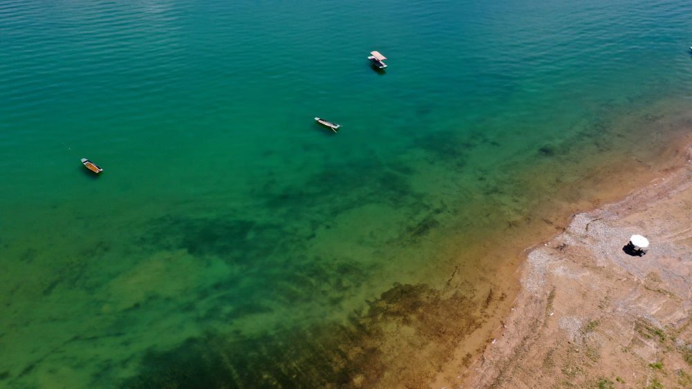 位于甘肃省临夏回族自治州永靖县境内刘家峡水库的黄河三湾碧波荡漾、岸线蜿蜒,片片小舟在水面摇曳,呈现一幅夏日清新画卷。