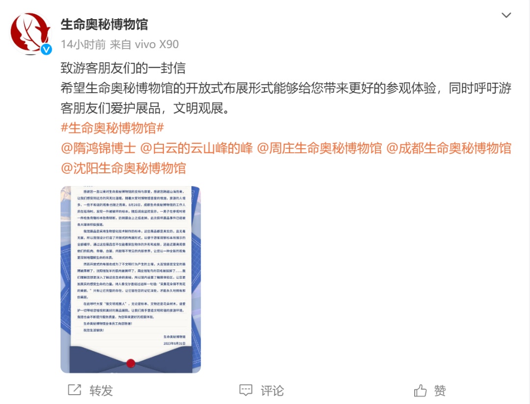 同时馆长表示,后续将加强巡查,博物馆不会因人为因素就将标本罩起来影响观众近距离沉浸式看展体验。