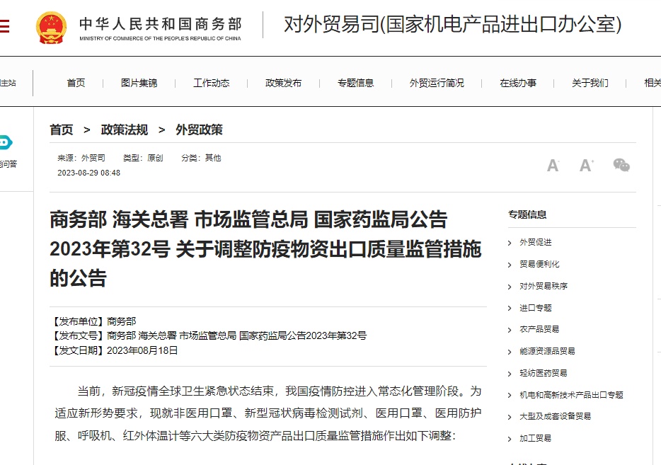关于调整防疫物资出口质量监管措施的公告