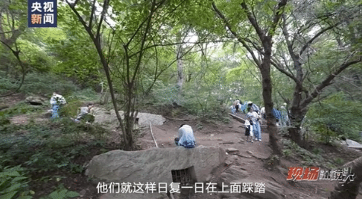 华山景区管理公司副总经理 雷剑明:这原本不允许游客过去,但游客用餐的时候就这样日复一日在上面踩踏,这个地方已经变得光秃秃了。