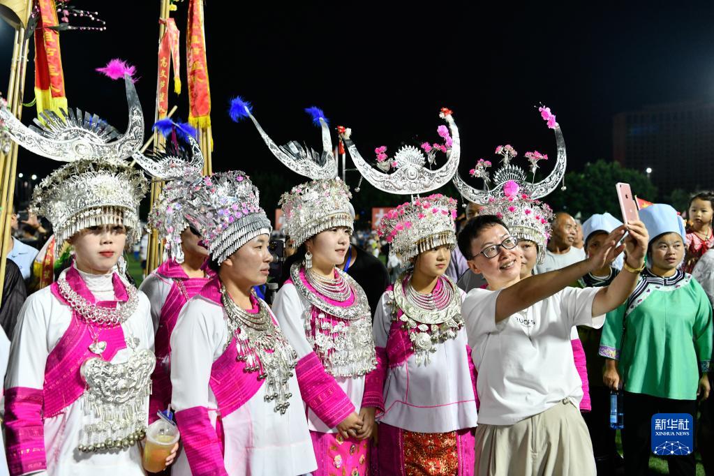 6月9日,一名游客在贵州“村超”足球比赛现场与少数民族拉拉队合影。新华社记者 杨文斌 摄