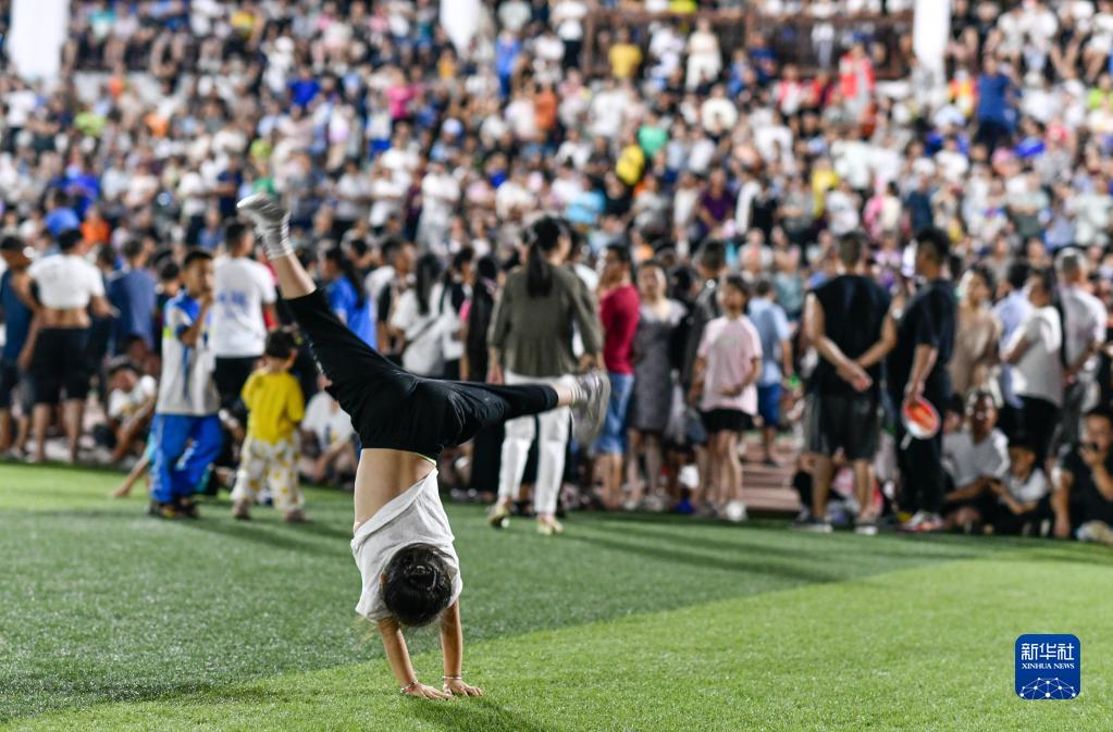 6月9日拍摄的贵州“村超”足球比赛休息期间的民族舞蹈表演(无人机照片)。新华社记者 刘勤兵 摄