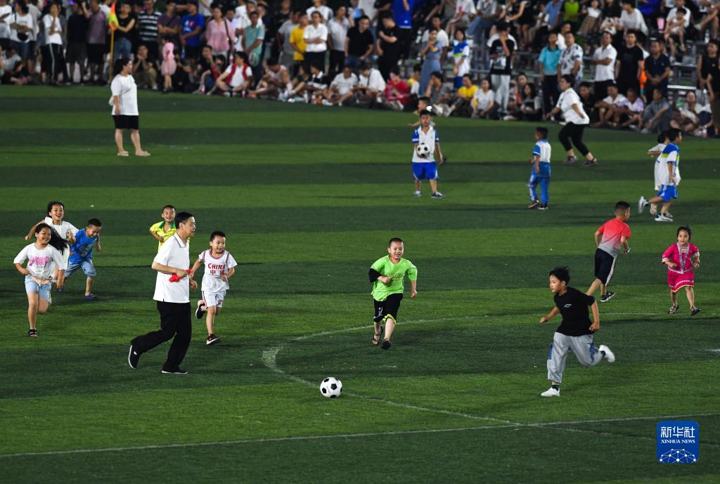 6月9日,小朋友在贵州“村超”足球比赛半场休息时间展示体操。新华社记者 杨文斌 摄