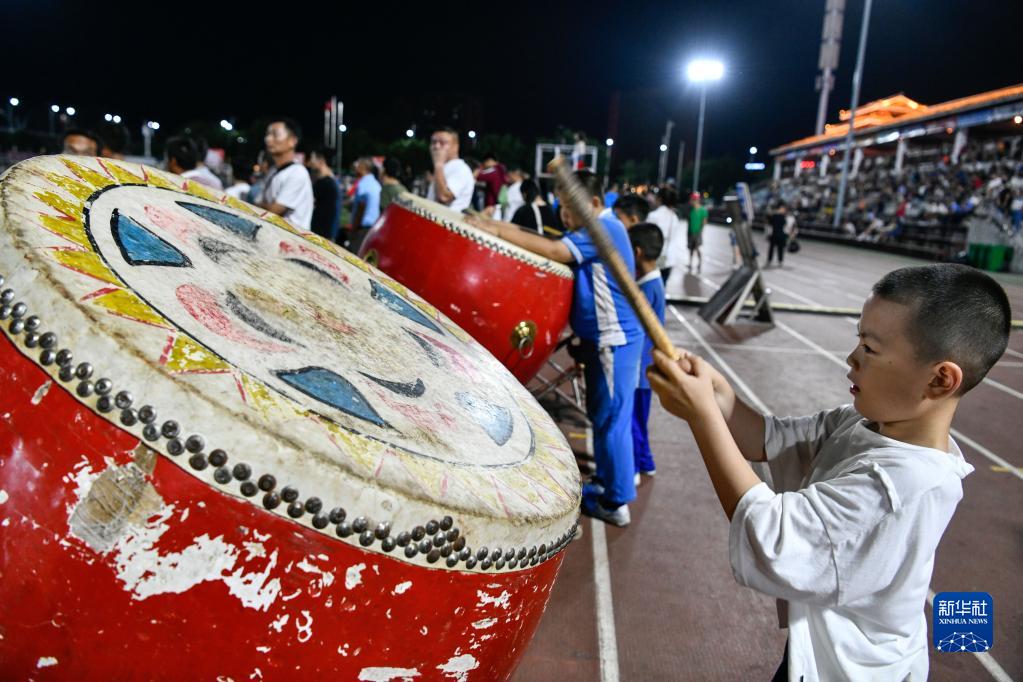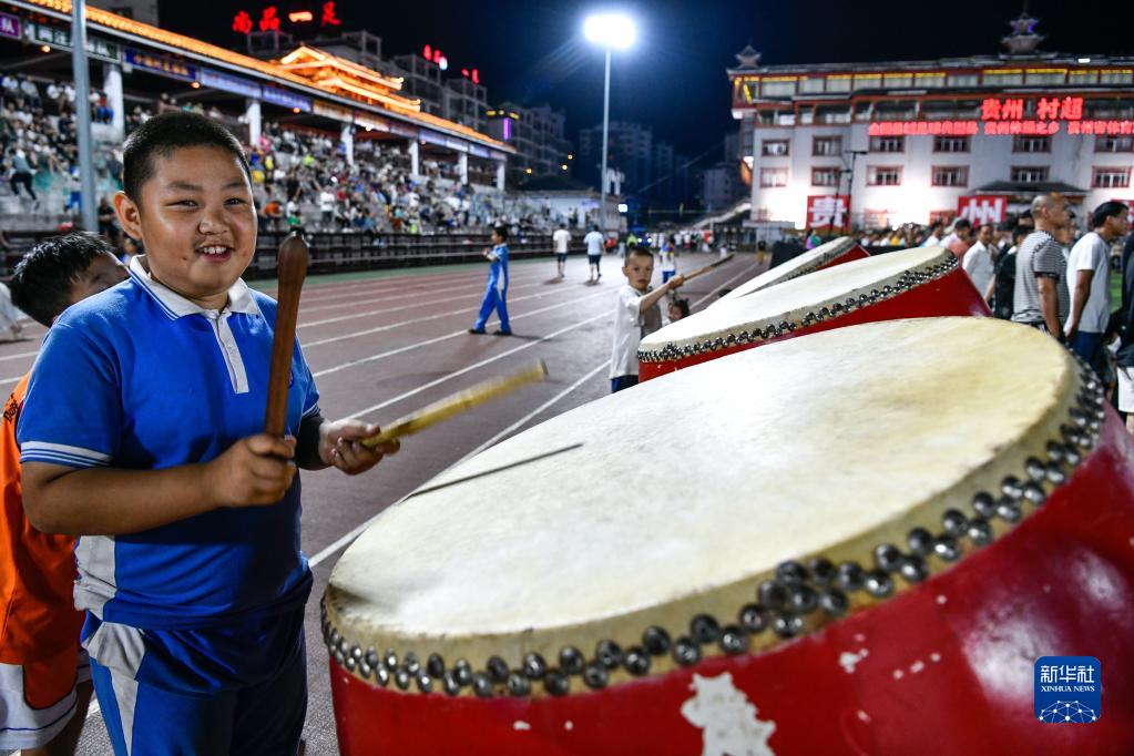 6月9日,一名小朋友在贵州“村超”足球比赛现场击鼓助威。新华社记者 杨文斌 摄