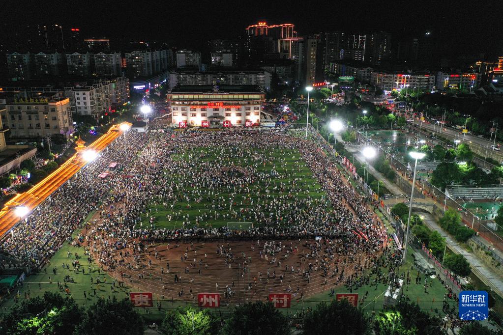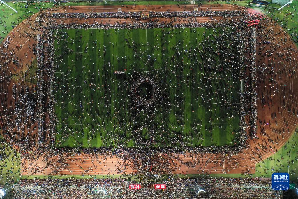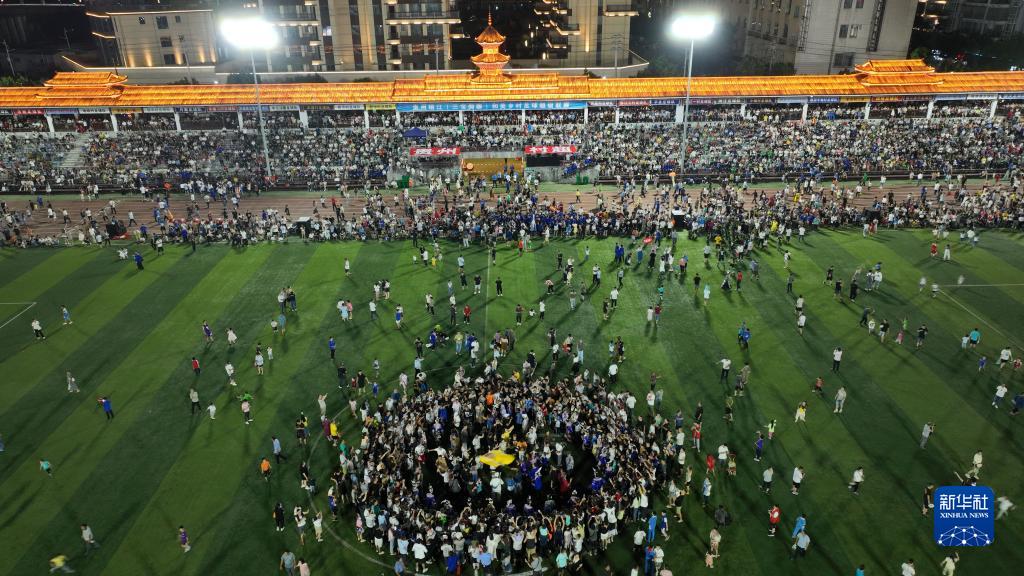 6月10日,演员在贵州“村超”足球比赛后表演民族舞蹈“多耶”,现场观众一起上场狂欢(无人机照片)。新华社记者 杨文斌 摄