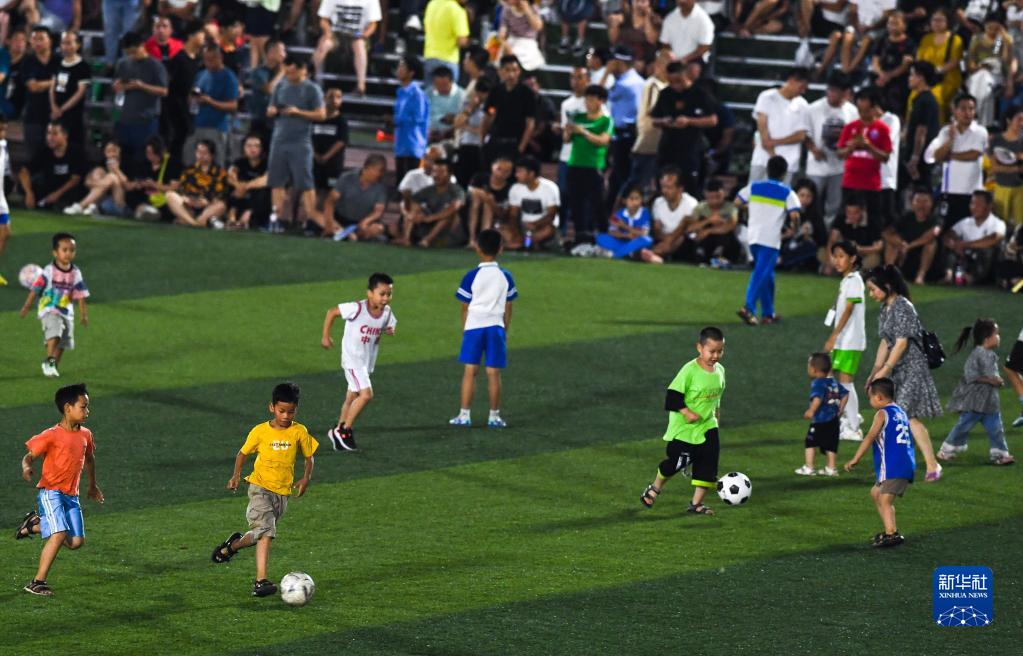 6月9日,小朋友们在贵州“村超”足球比赛半场休息时间上场踢球。新华社记者 杨文斌 摄