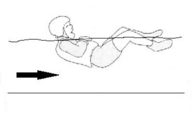 (2)保持膝盖呈微弯状,用手臂设置一个摆渡角度以引导自身在水面的位置,如需改变漂流方向或减缓流速时,可采用仰泳且用双手辅助游泳。